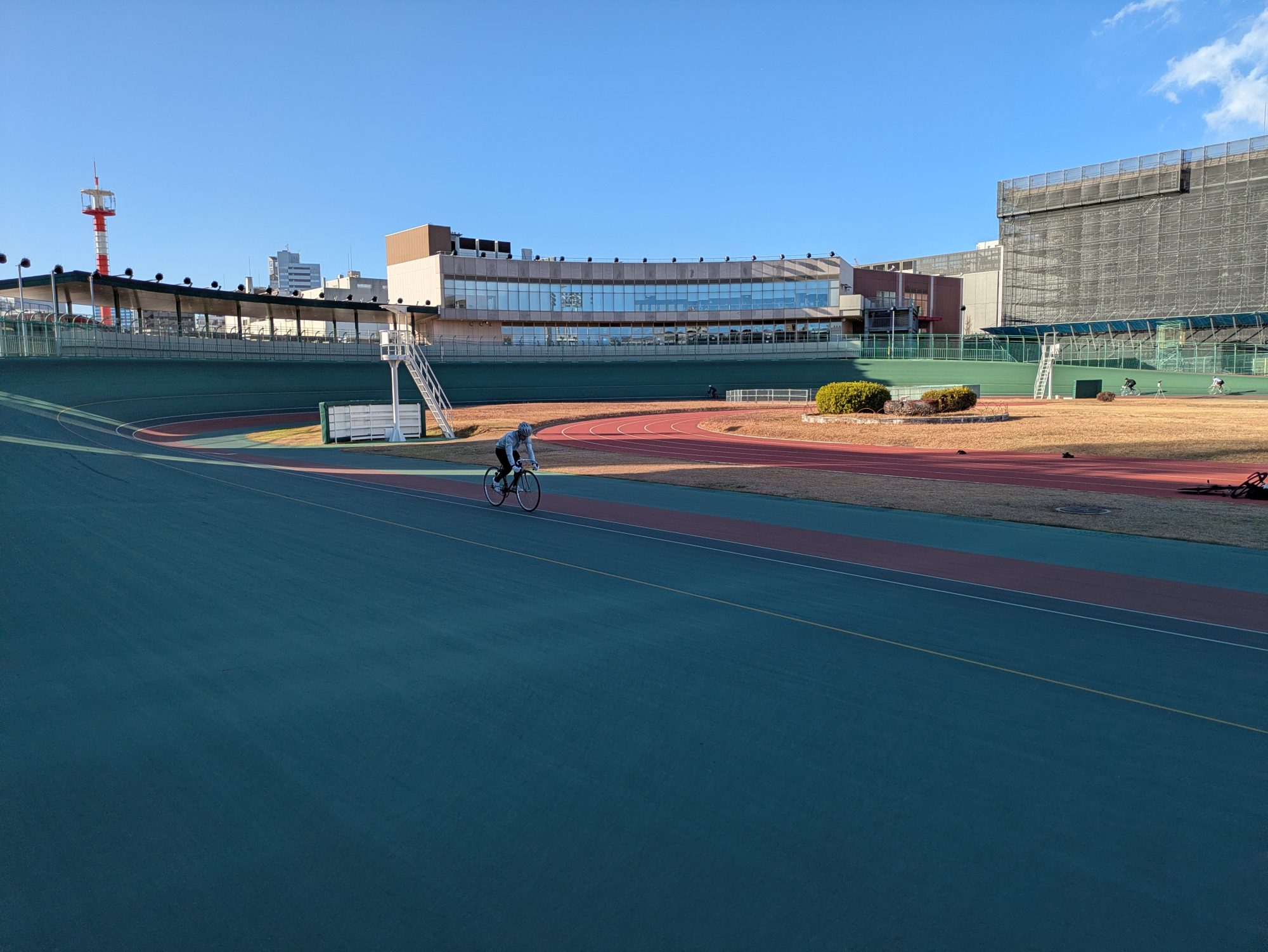 快晴だったのですが風が徐々に強くなり、特にホームでは強い向かい風に煽られる状況になりました。そんな中で落車する参加者もおり、計測は中止して、自由走行に時間を割きました。落車した参加者は病院で検査を受け、擦過傷以外は大事ないとの報告を受けました。スポーツ団体保険で対応いたしました。